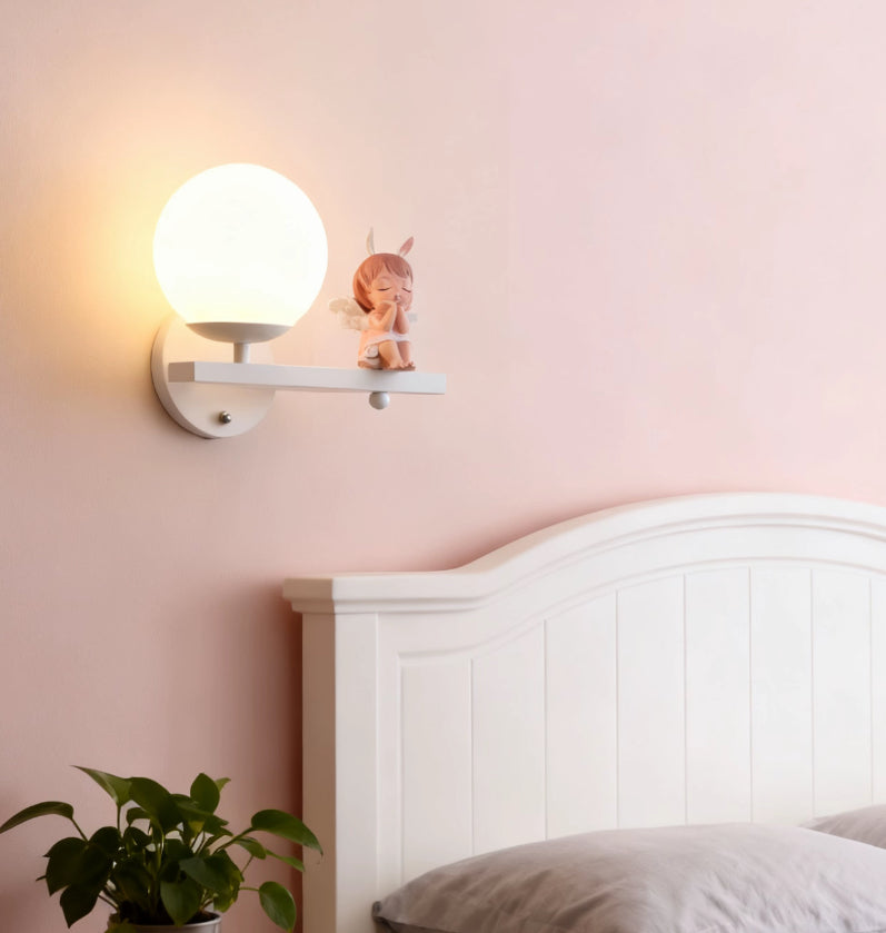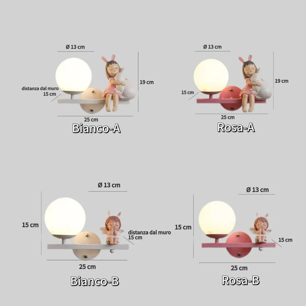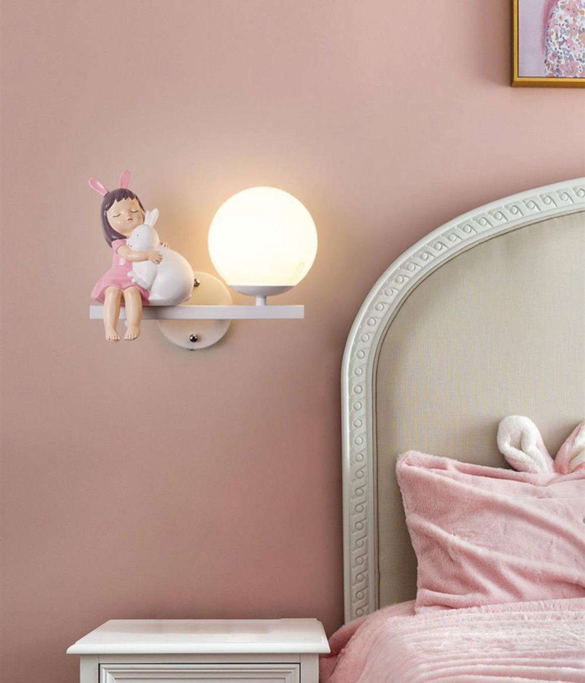 Questa applique da parete per la cameretta dei bambini presenta un design adorabile ispirato a una bambina e un coniglietto bianco. La bambina indossa un grazioso vestitino e un cerchietto con orecchie da coniglio, abbracciando teneramente il coniglietto rotondetto con un'espressione serena, come se stesse vegliando su ogni sogno del bambino.Per quanto riguarda l'illuminazione, la lampada utilizza una luce naturale protettiva per gli occhi, priva di luce blu dannosa, per salvaguardare la vista delicata dei più piccoli. Supporta tre modalità di colore della luce, permettendo di adattarla a diversi scenari e alle preferenze dei bambini.Il corpo della lampada è realizzato in ferro con finitura verniciata a polvere ad alta temperatura, che lo rende resistente alla corrosione, alla ruggine, durevole nel tempo e facile da pulire. Il colore rosa si adatta perfettamente ai gusti estetici infantili ed è facilmente abbinabile allo stile delle camerette.