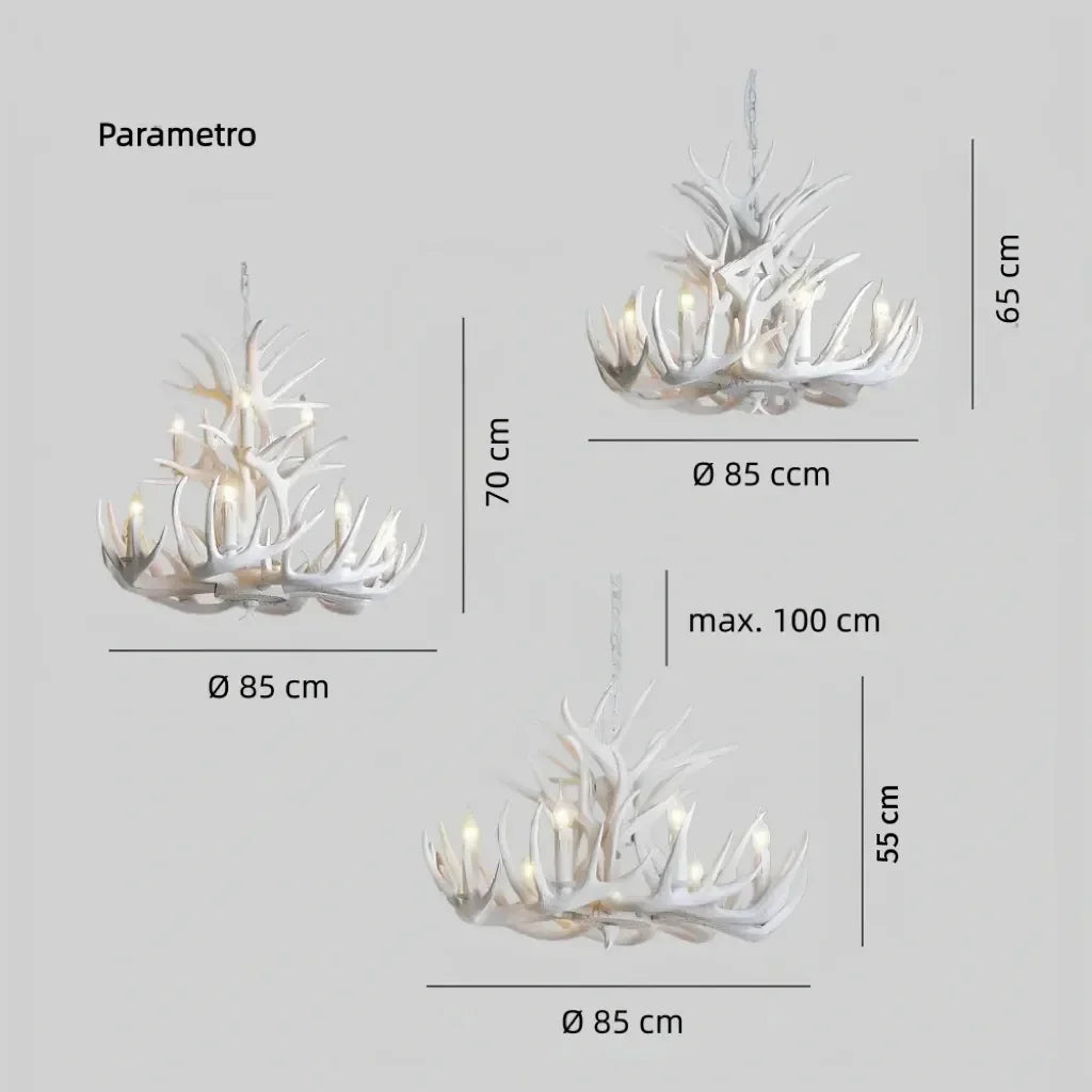Lampadario vintage a forma di corna di cervo in resina bianca, perfetto per uno stile industriale. La struttura realizzata artigianalmente e lucidata a mano aggiunge un tocco di rustica eleganza. Disponibile in tre diverse altezze. Ideale per illuminare soggiorni e sale da pranzo con un tocco decorativo unico e sofisticato.