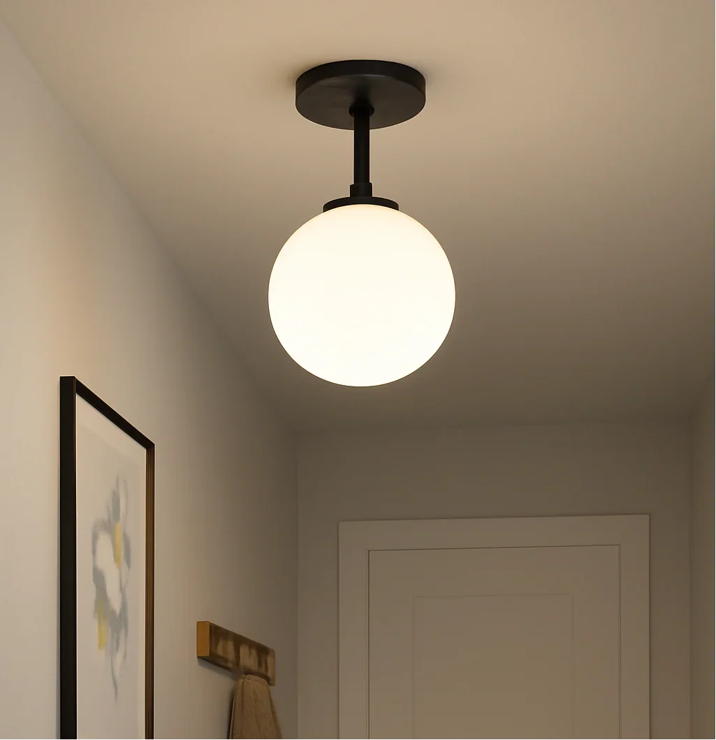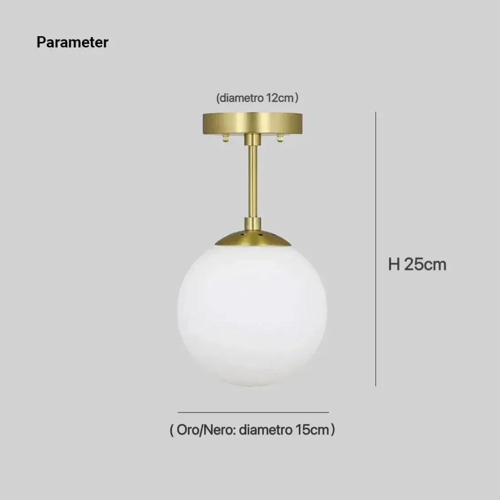 Questa plafoniera da corridoio si ispira a un design sferico semplice ed elegante, con linee morbide e fluide e una forma pulita ed essenziale, perfettamente in sintonia con lo stile moderno e minimalista degli ambienti domestici. Il corpo della lampada è realizzato con una solida base in metallo, rifinita con una verniciatura epossidica accurata che la rende antiruggine, resistente e ne valorizza la texture e la brillantezza. Il paralume in vetro bianco diffonde la luce in modo uniforme e delicato, creando un’atmosfera calda e accogliente quando la lampada è accesa.