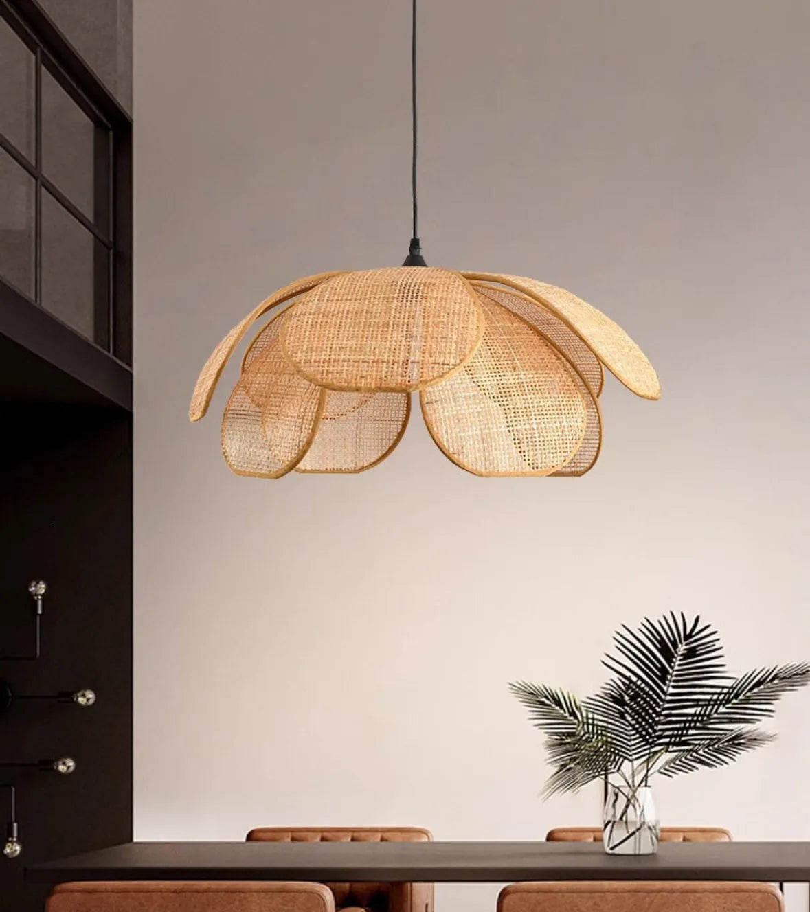 Questo creativo lampadario in rattan presenta un design a forma di petalo, creando un'atmosfera sofisticata e calda.La tradizionale lavorazione artigianale del rattan intrecciato a mano si basa sulla bellezza e sul concetto di tutela ambientale, esplorando costantemente il nuovo fascino del rattan. Aggiungerà un tocco di tranquillità e fascino naturale al vostro spazio naturale ed è la scelta ideale per l'illuminazione di ristoranti.