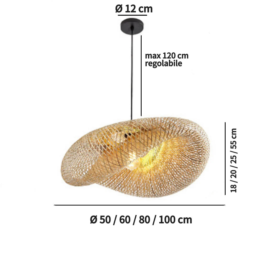 Lampadari in bambù intreccio artigianale per sala da pranzo. Realizzati in bambù naturale lavorato a mano, offrono uno stile autentico ed ecologico. Dotati di portalampada E27 che diffonde una luce calda e accogliente, fornisci un'illuminazione ecocompatibile per il tuo ristorante.