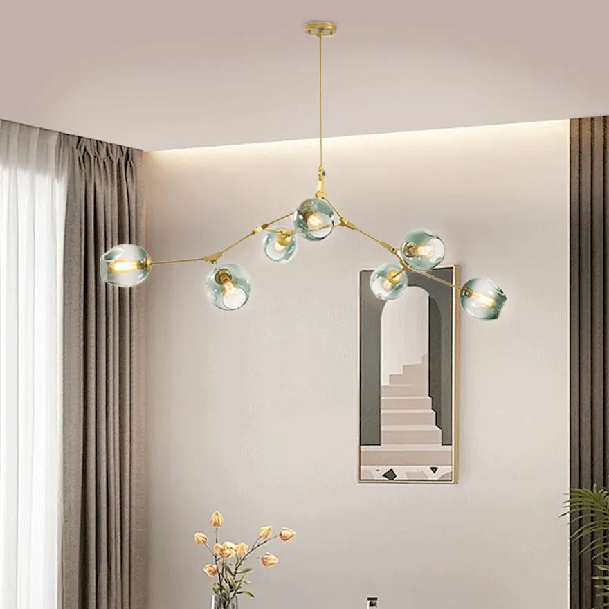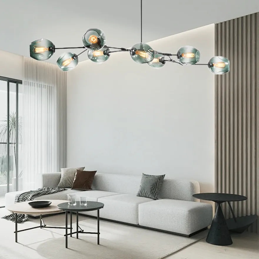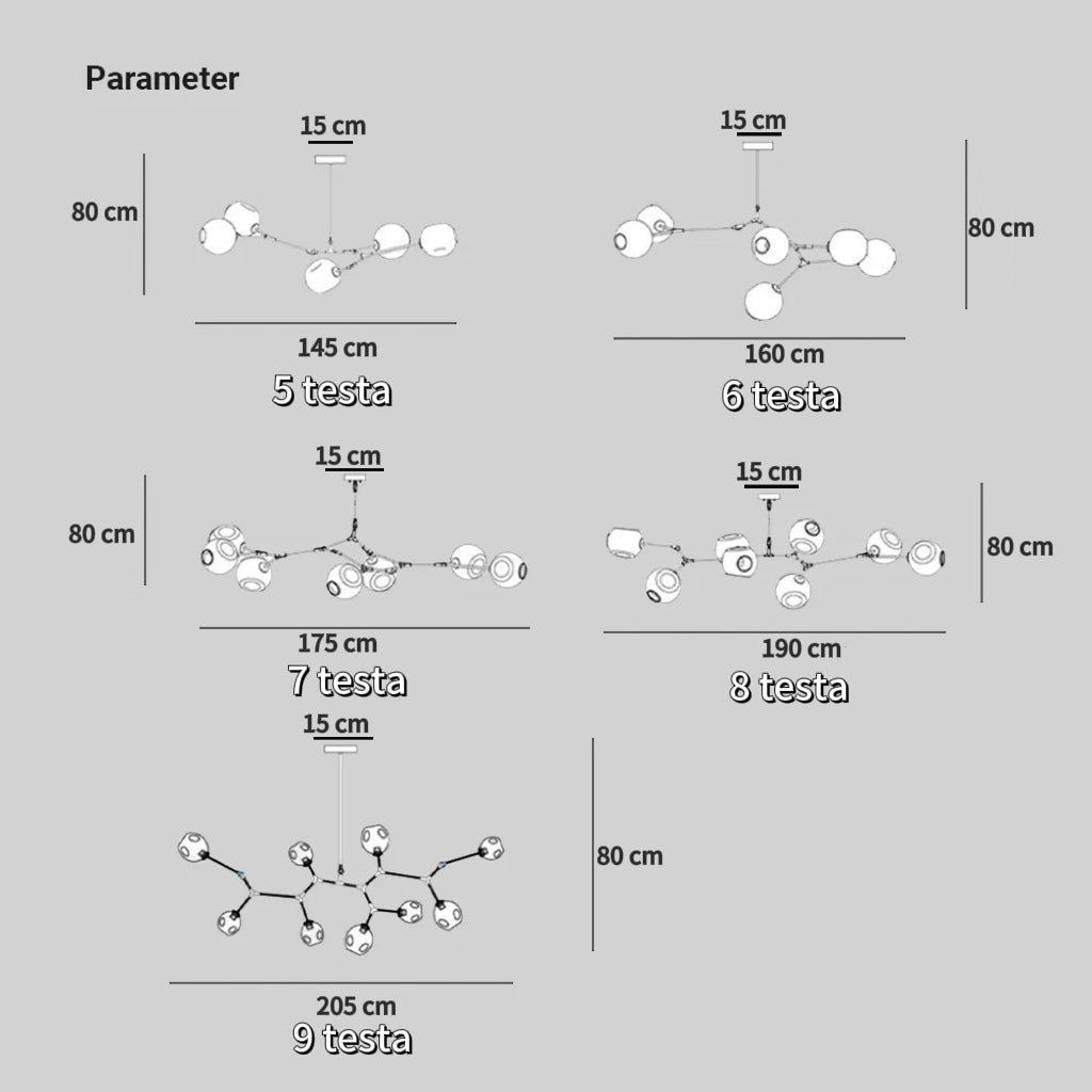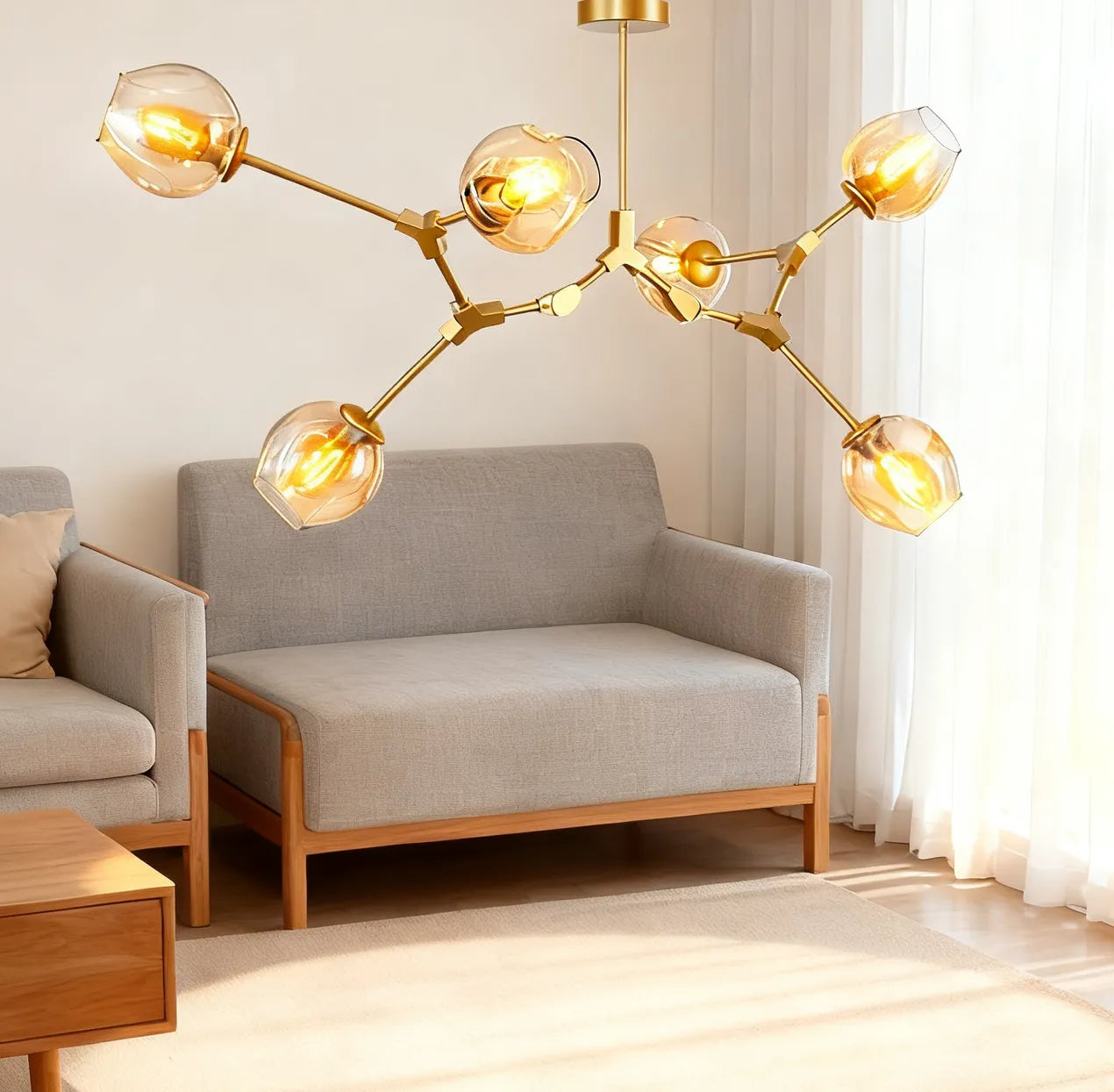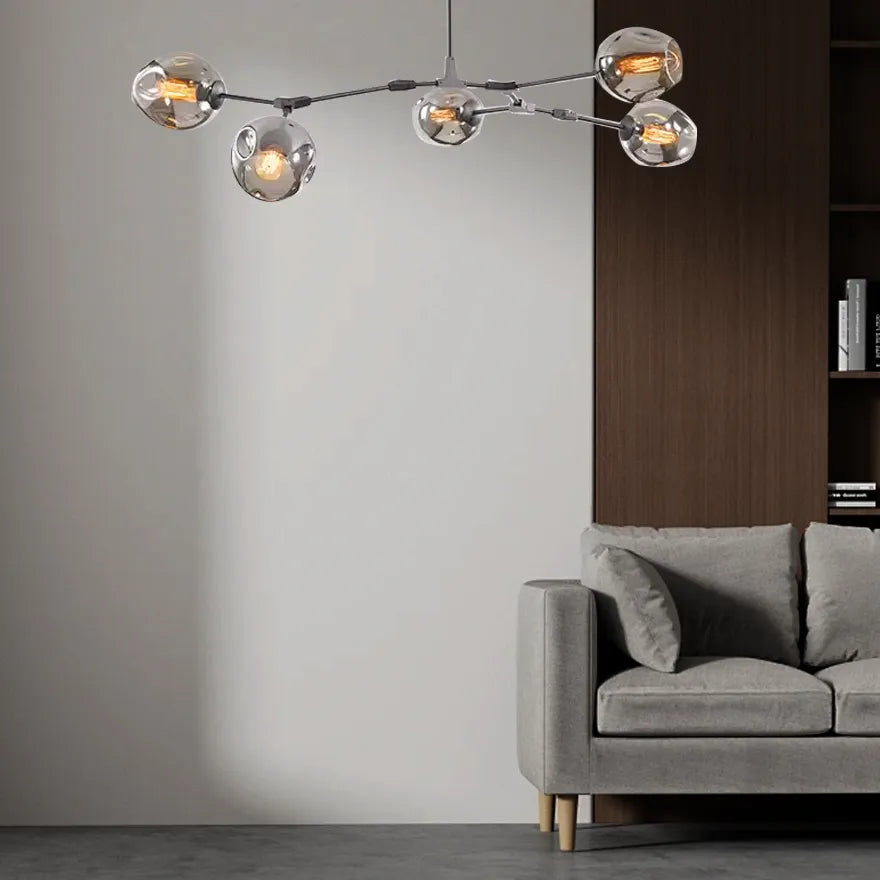Lampadario sospeso moderno in vetro con design molecolare, ideale per il soggiorno.Il nodo rotante regolabile permette di personalizzare la forma. Il paralume in vetro soffiato a mano offre una luce morbida e protettiva per gli occhi. La struttura in metallo verniciato a forno è resistente alla corrosione e durevole. Portalampada E27 resistente alle alte temperature, lunga durata, sicuro e stabile da usare.