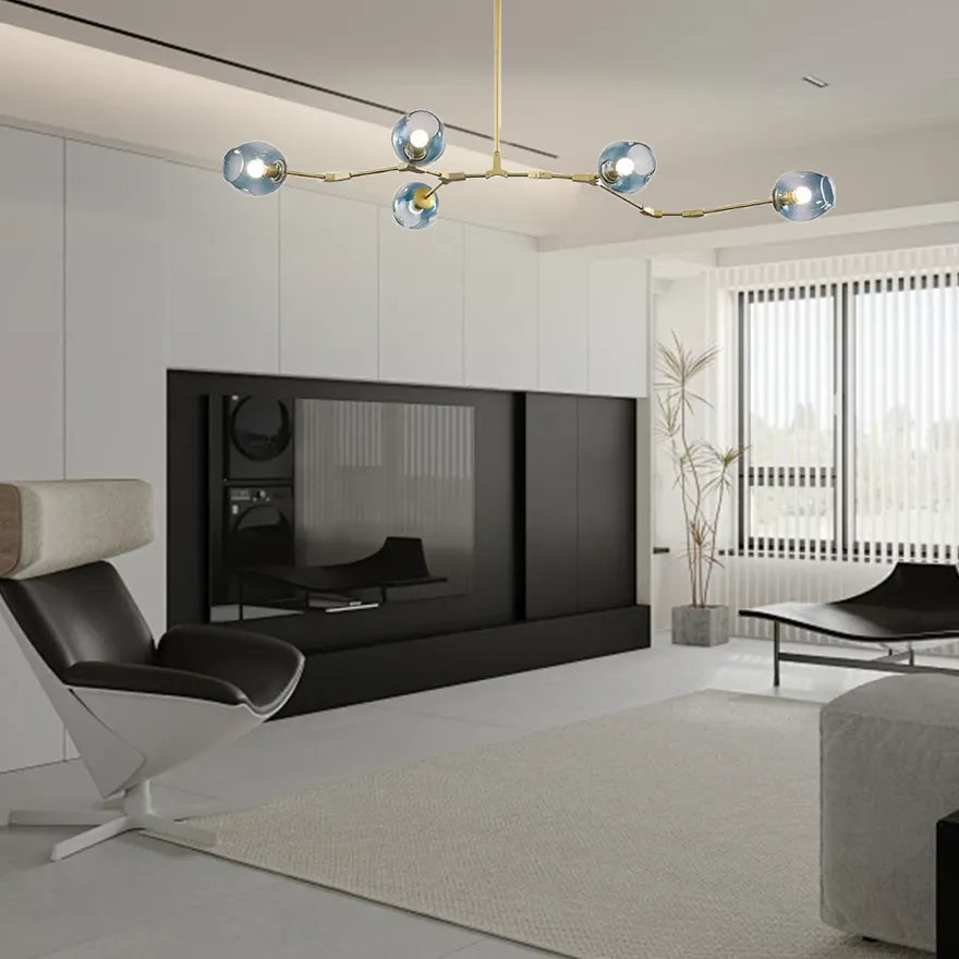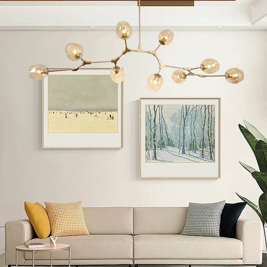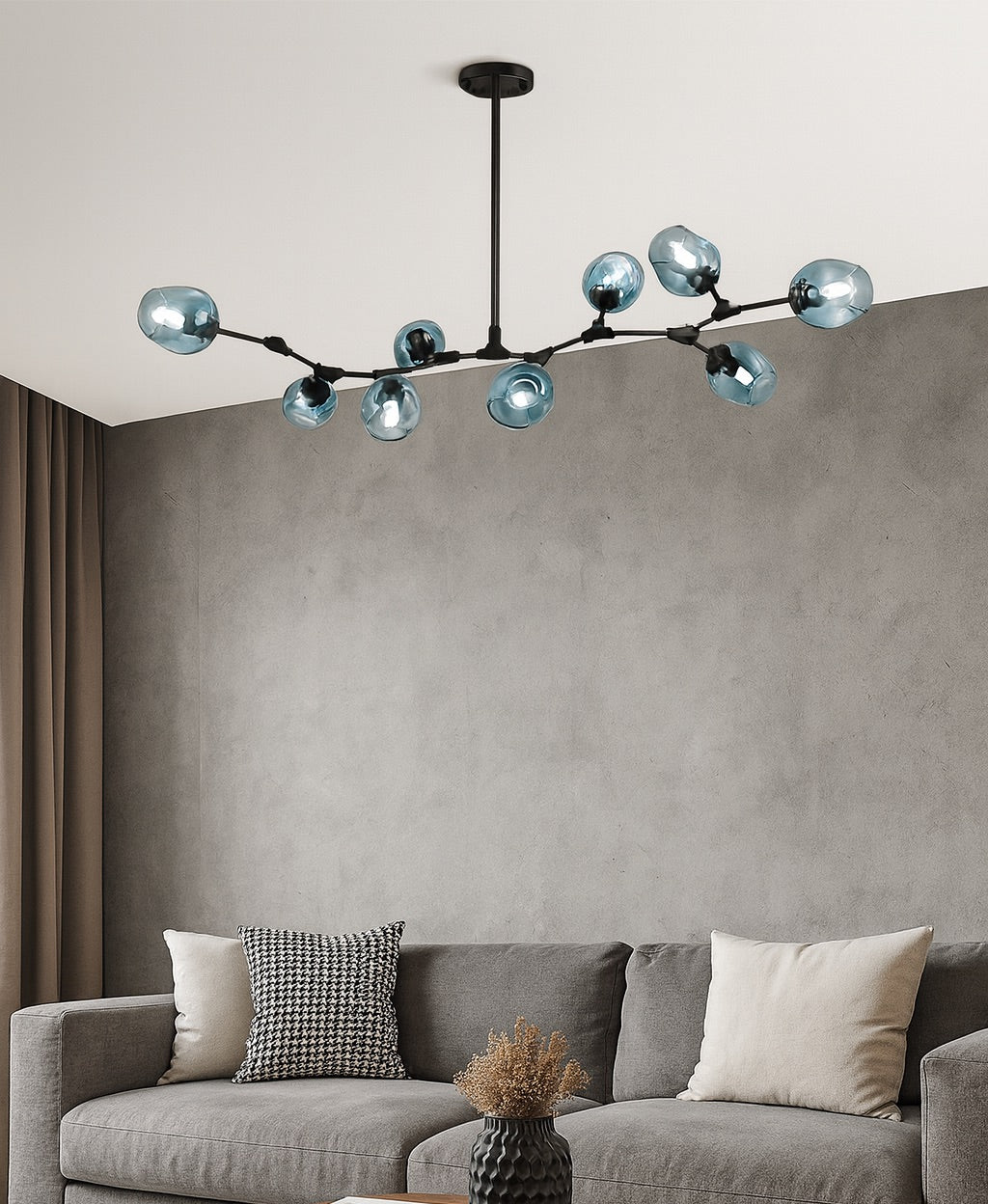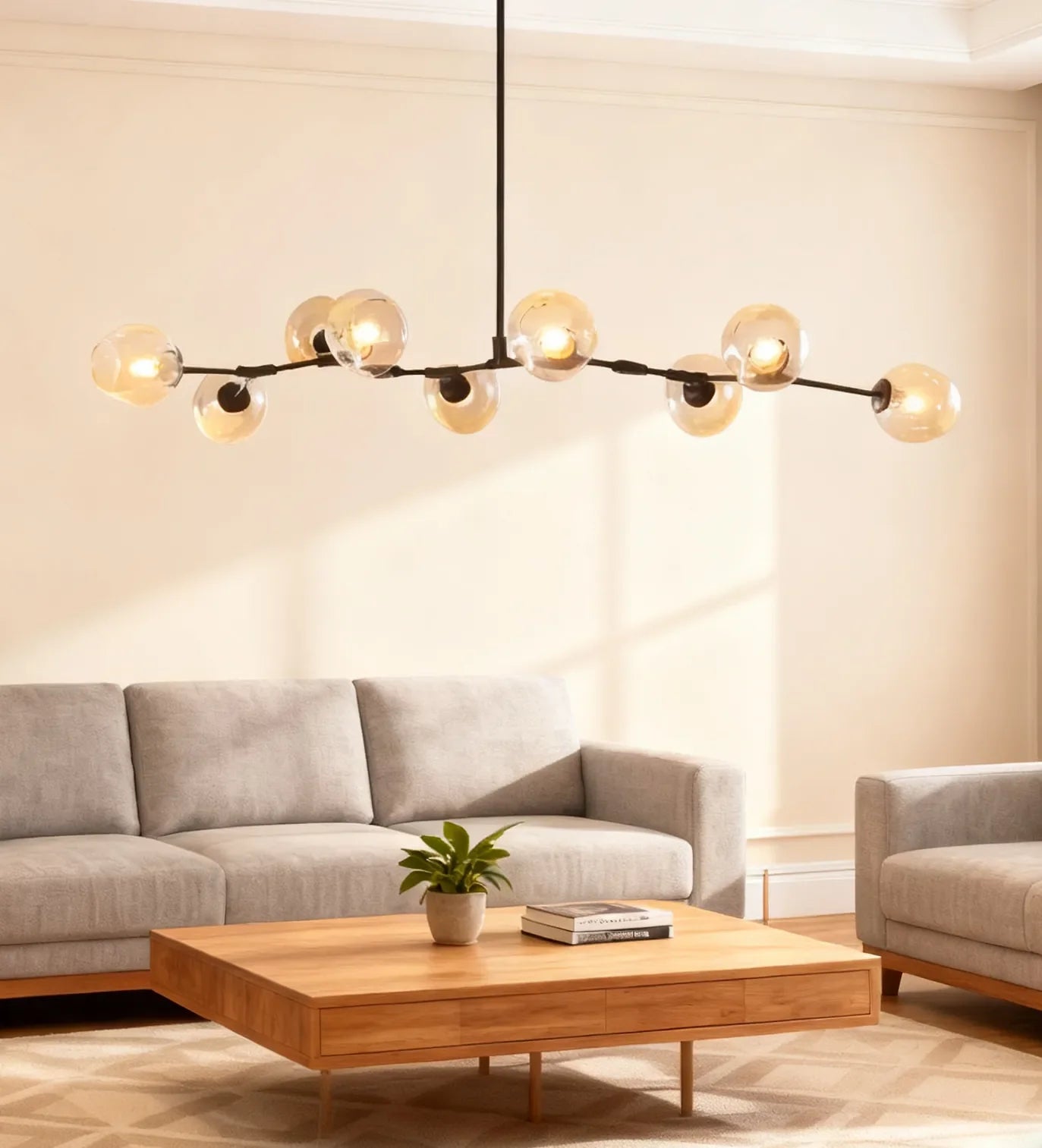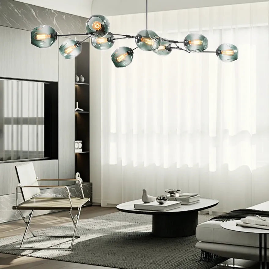 Lampadario sospeso moderno in vetro con design molecolare, ideale per il soggiorno.Il nodo rotante regolabile permette di personalizzare la forma. Il paralume in vetro soffiato a mano offre una luce morbida e protettiva per gli occhi. La struttura in metallo verniciato a forno è resistente alla corrosione e durevole. Portalampada E27 resistente alle alte temperature, lunga durata, sicuro e stabile da usare.