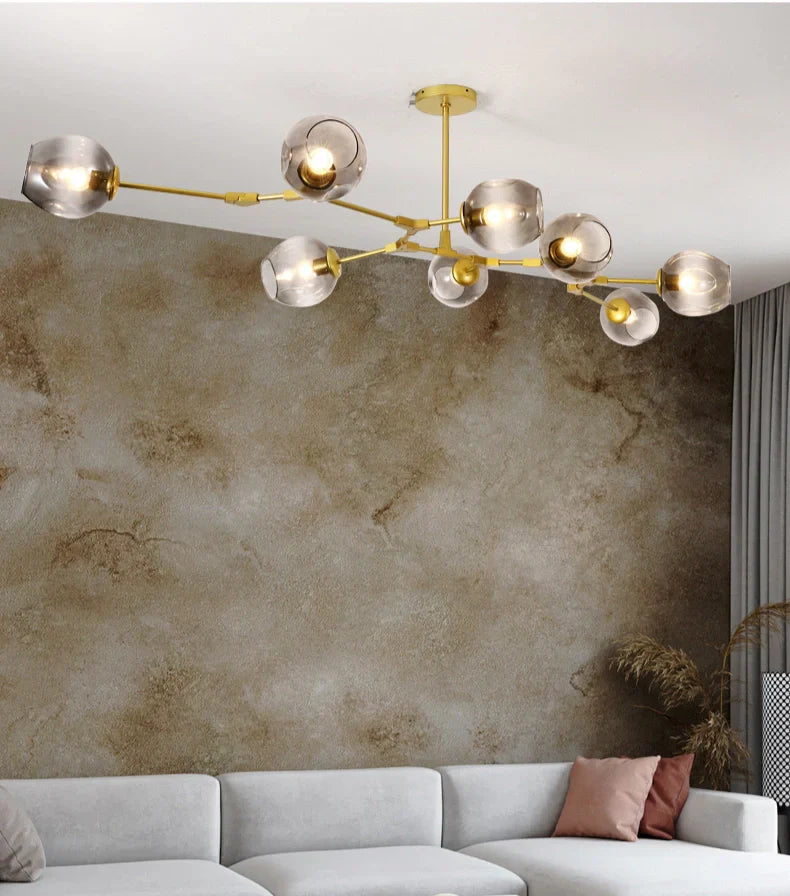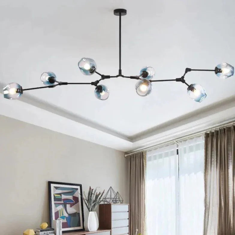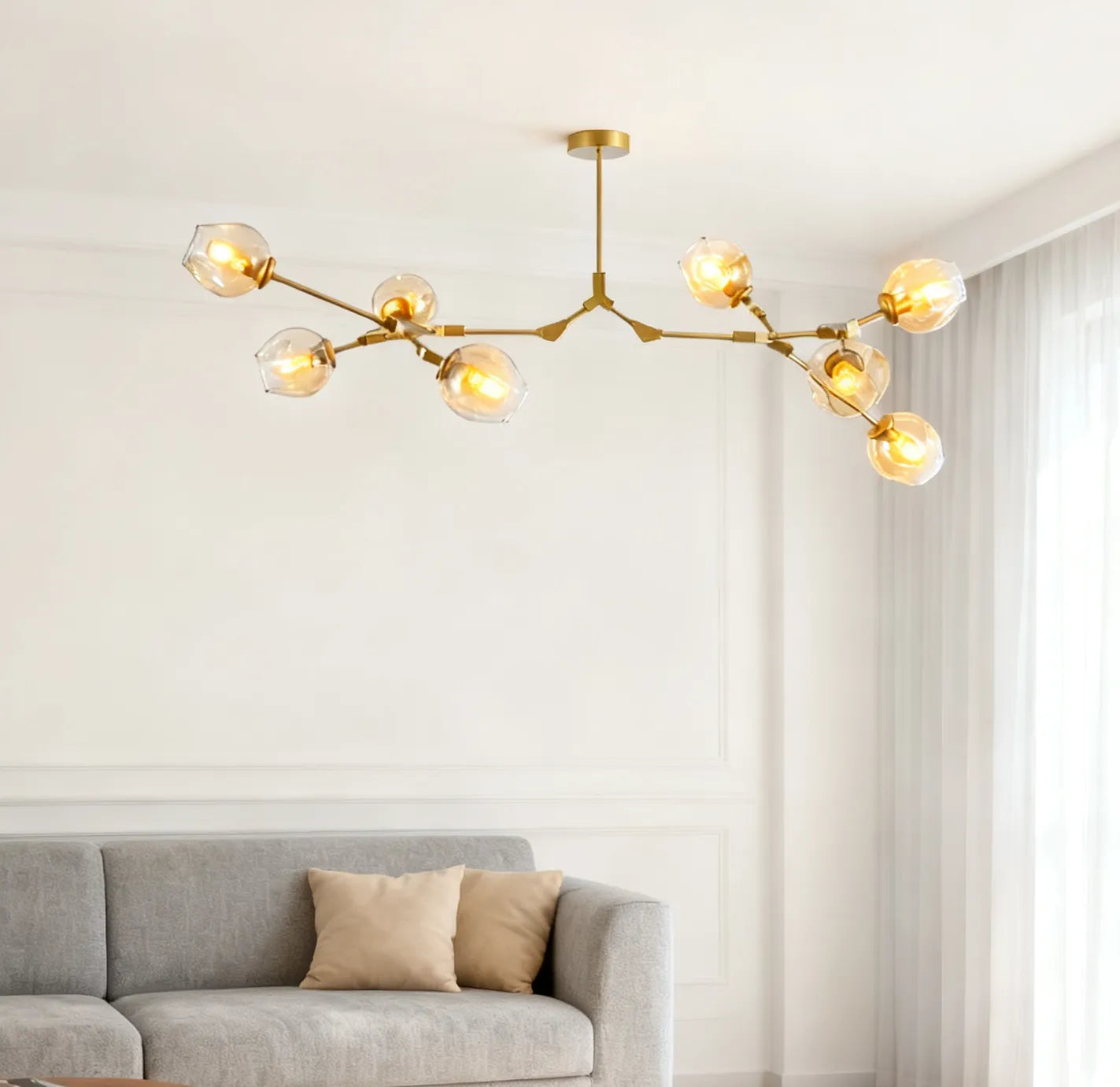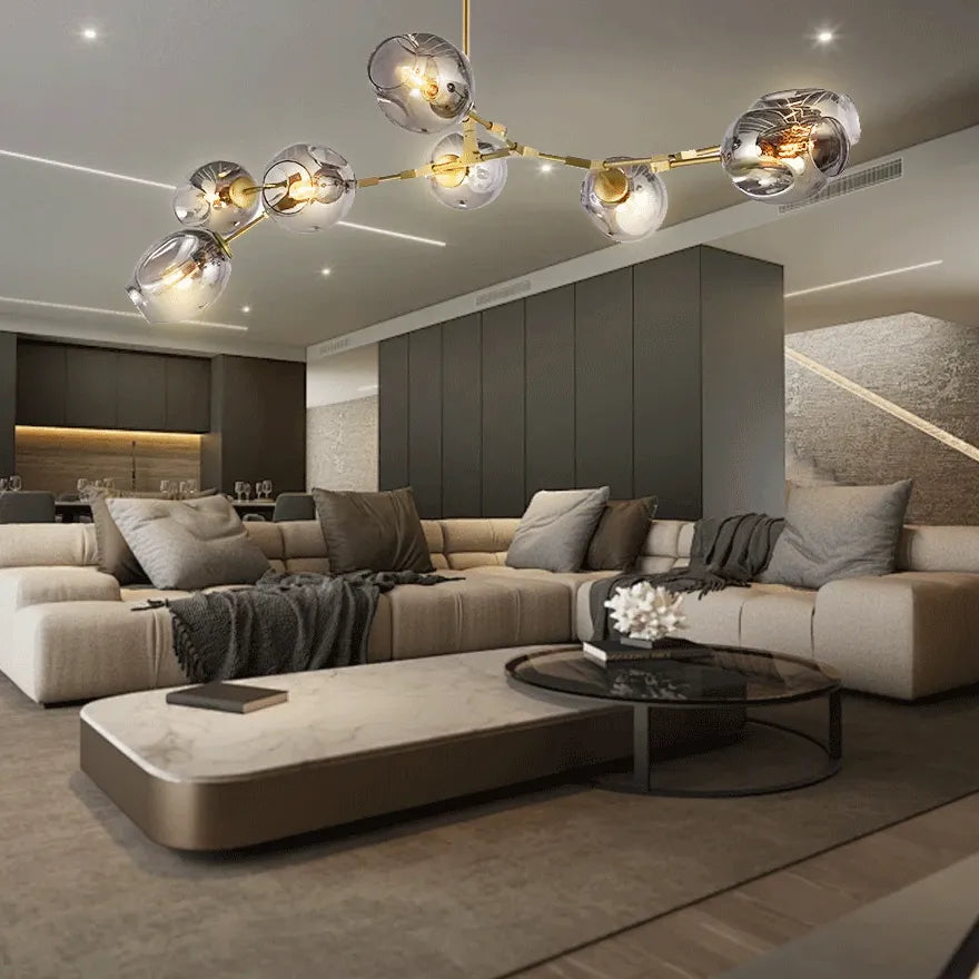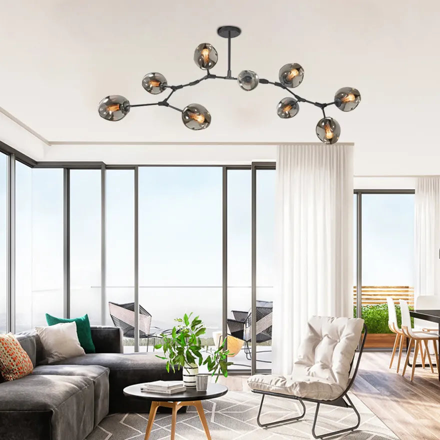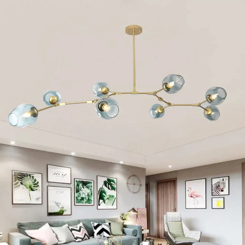 Lampadario sospeso moderno in vetro con design molecolare, ideale per il soggiorno.Il nodo rotante regolabile permette di personalizzare la forma. Il paralume in vetro soffiato a mano offre una luce morbida e protettiva per gli occhi. La struttura in metallo verniciato a forno è resistente alla corrosione e durevole. Portalampada E27 resistente alle alte temperature, lunga durata, sicuro e stabile da usare.