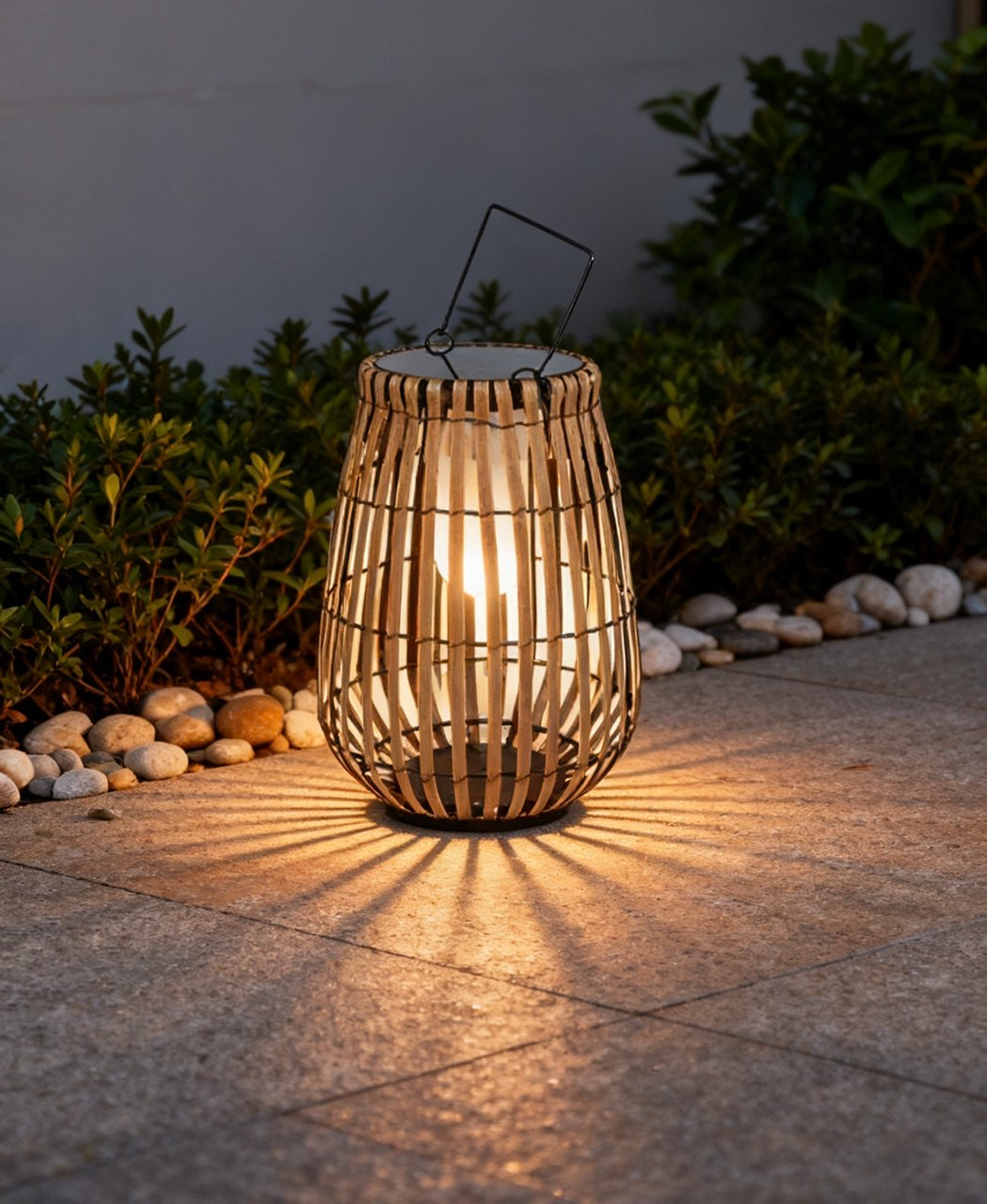 Lampade solari da terra da esterno impermeabili con grado IP65, resistenti a pioggia e intemperie. Pannello solare ad alta efficienza, corpo intrecciato effetto bambù con rinforzo in filo metallico. LED a basso consumo con luce calda e uniforme, pratica maniglia rotabile a 180°.Perfetto per illuminare il tuo ambiente esterno.
