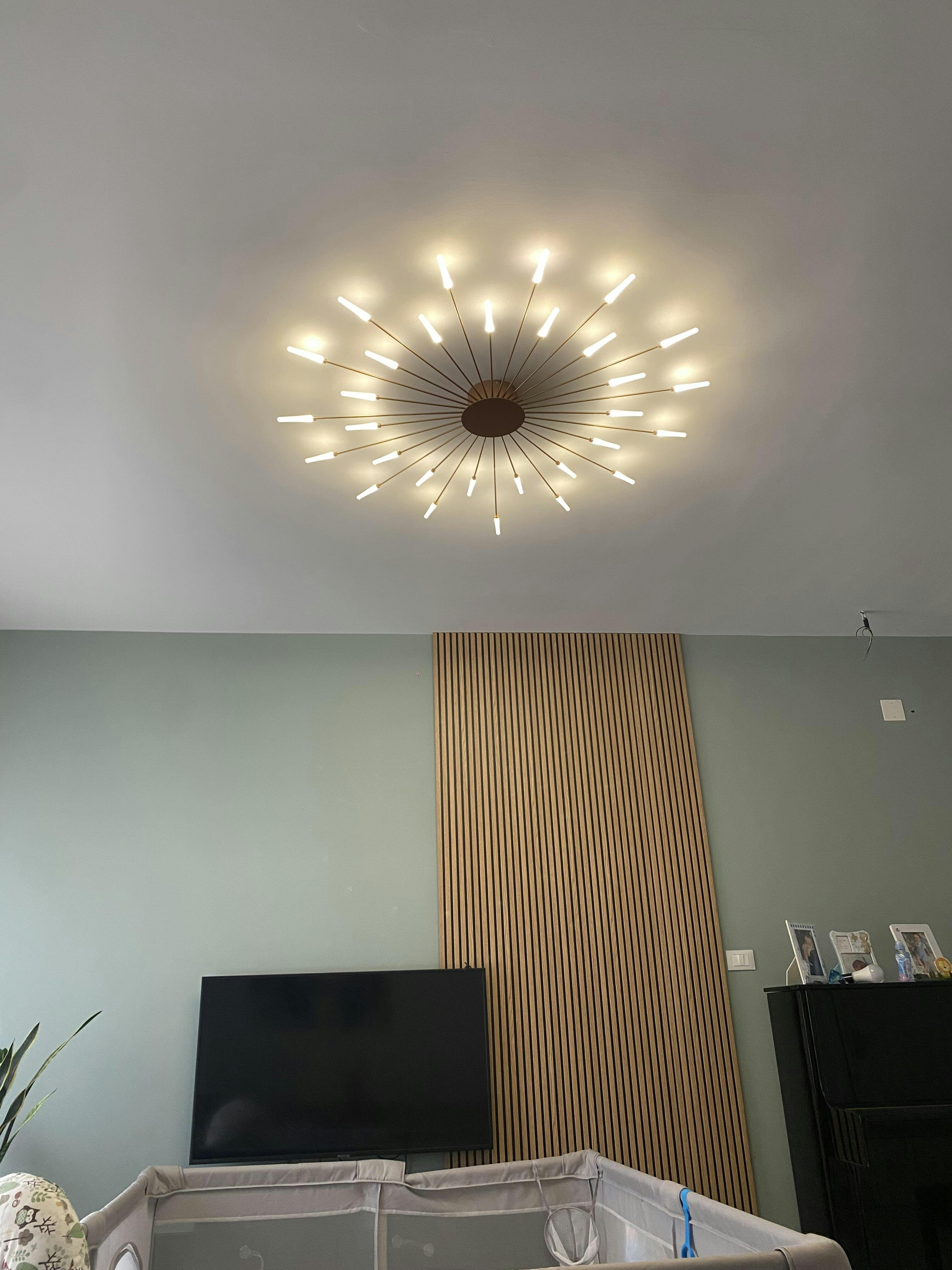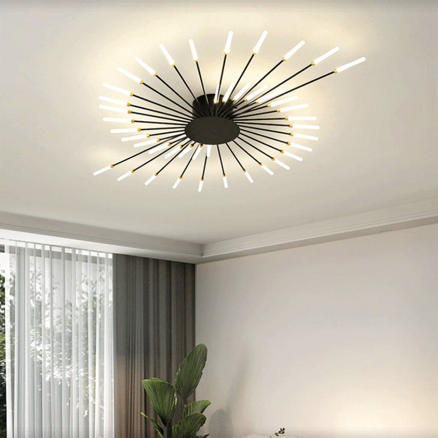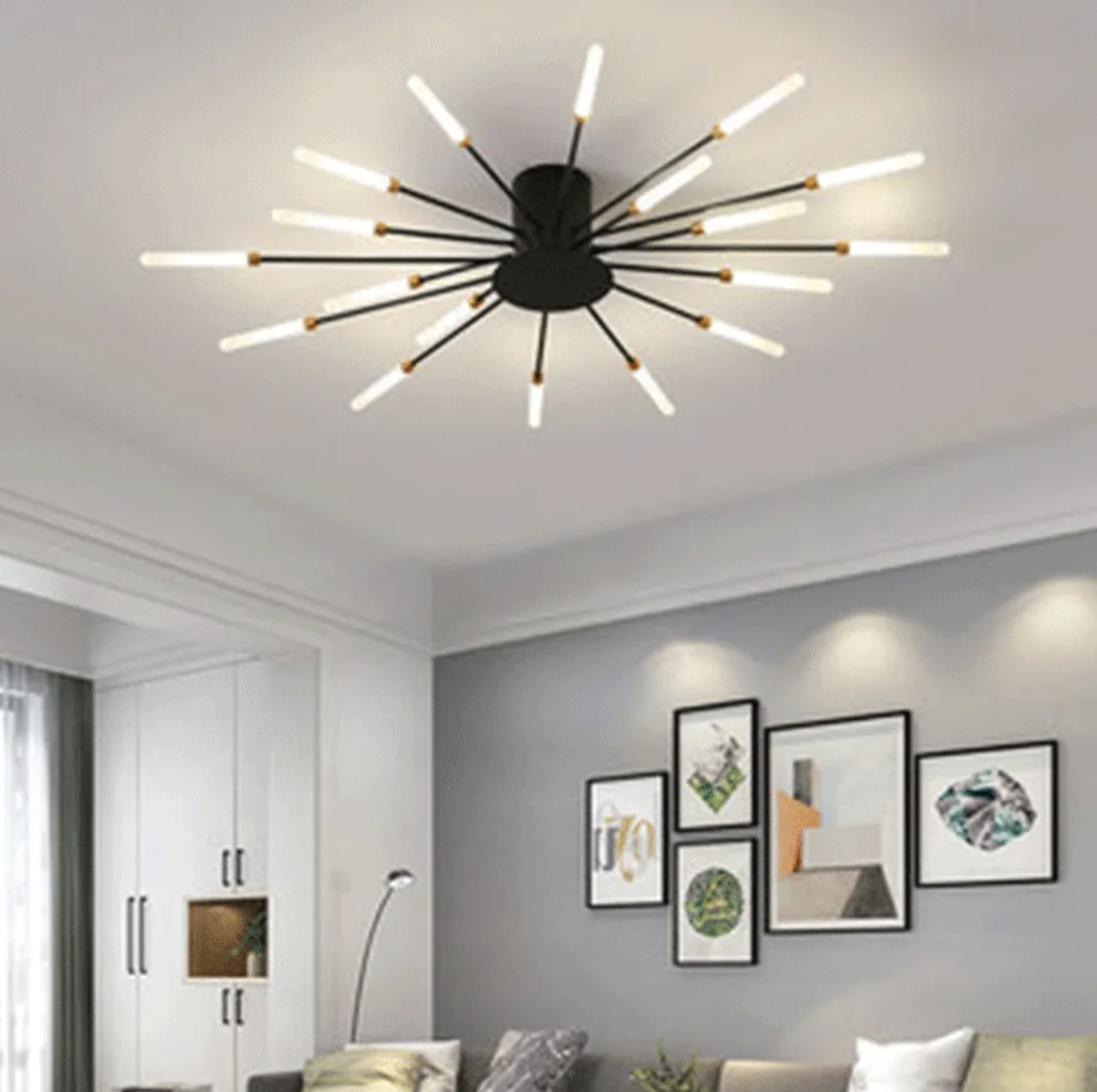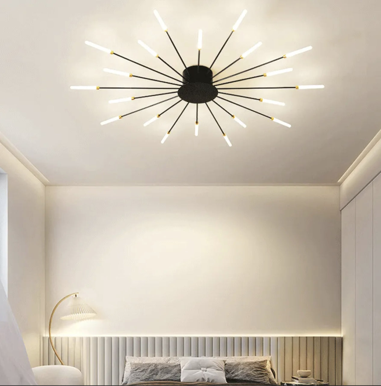 Questa lampada a soffitto LED moderna adotta un design sputnik. creando un effetto luminoso decorativo e spettacolare.La luce si diffonde a 360 gradi.Dotata di funzione dimmerabile, la luce è priva di sfarfallio e di luce blu nociva, proteggendo gli occhi e offrendo un'esperienza visiva confortevole.Offri un'esperienza di illuminazione confortevole per il tuo soggiorno.