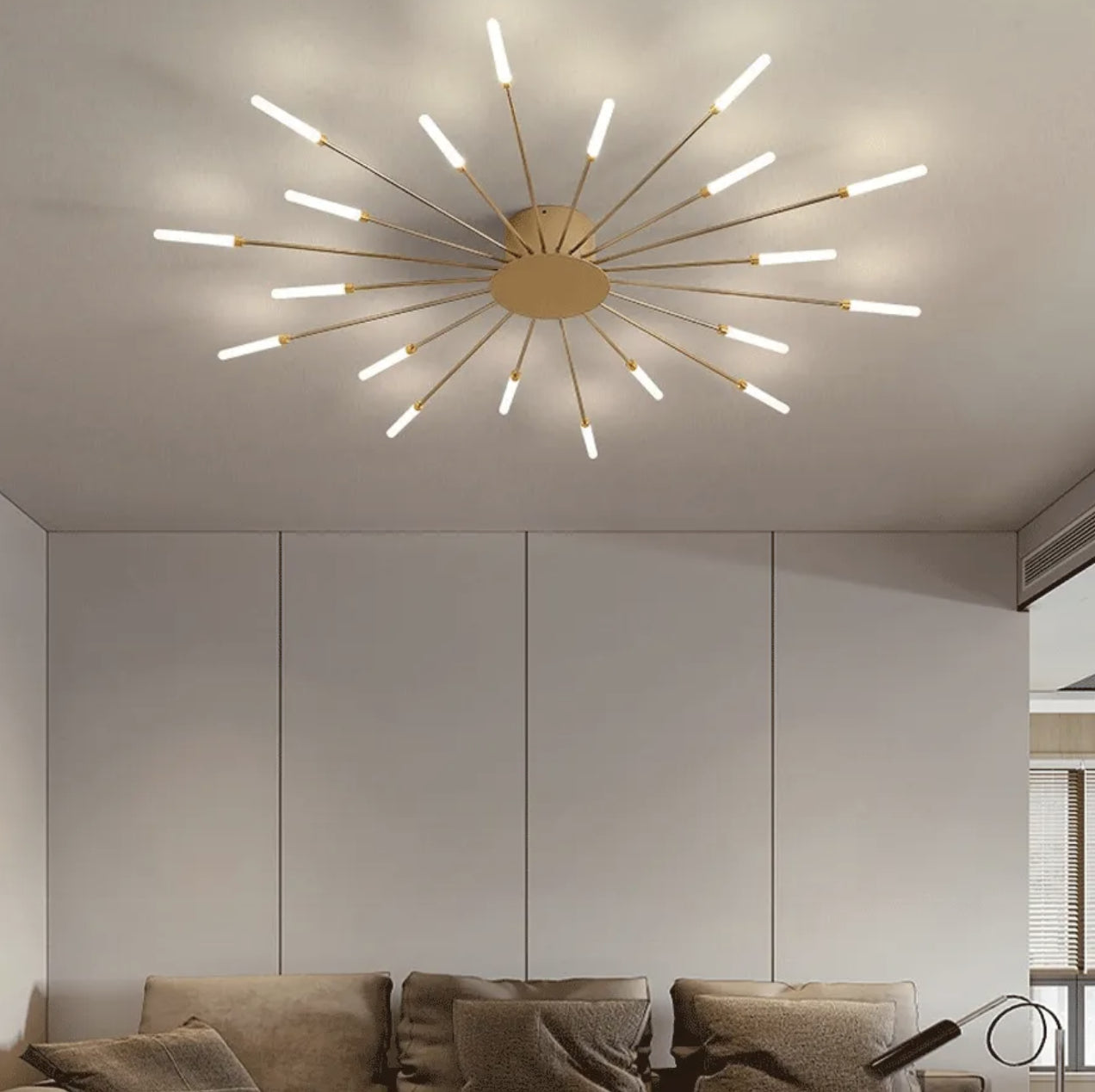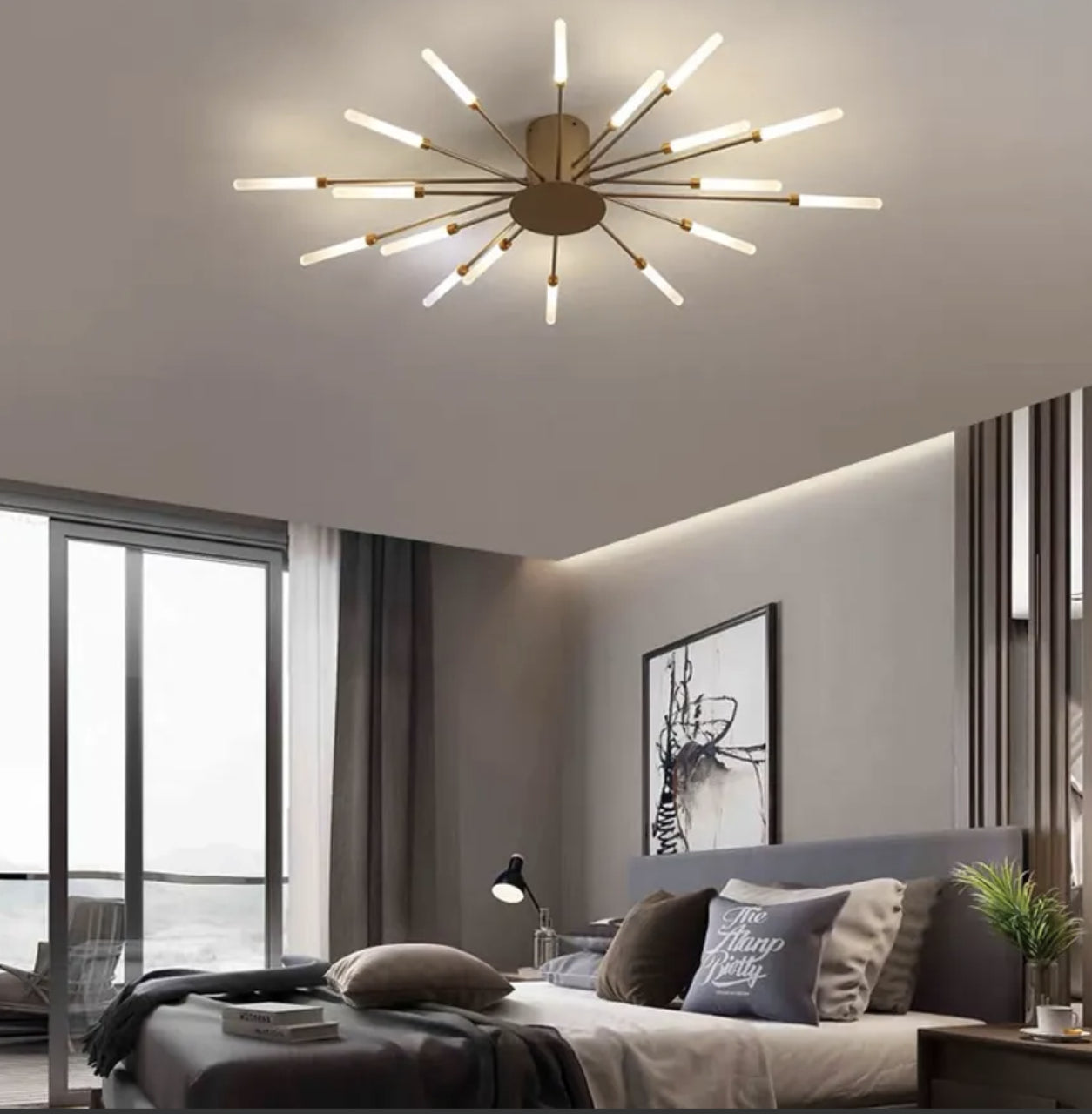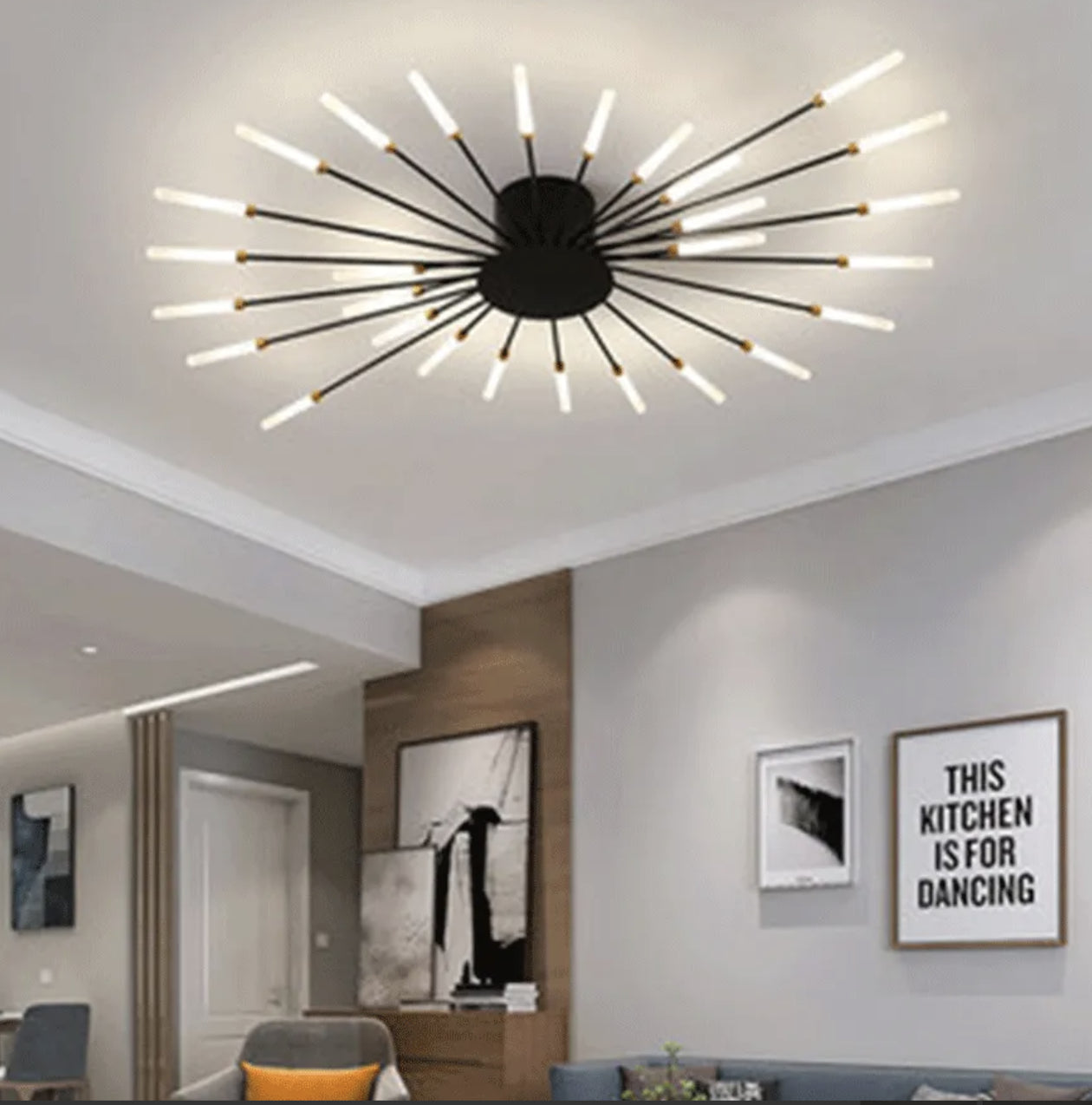 Questa lampada a soffitto LED moderna adotta un design sputnik. creando un effetto luminoso decorativo e spettacolare.La luce si diffonde a 360 gradi.Dotata di funzione dimmerabile, la luce è priva di sfarfallio e di luce blu nociva, proteggendo gli occhi e offrendo un'esperienza visiva confortevole.Offri un'esperienza di illuminazione confortevole per il tuo soggiorno.