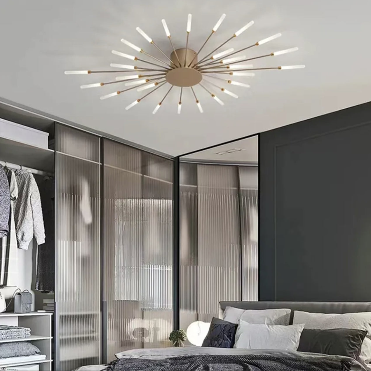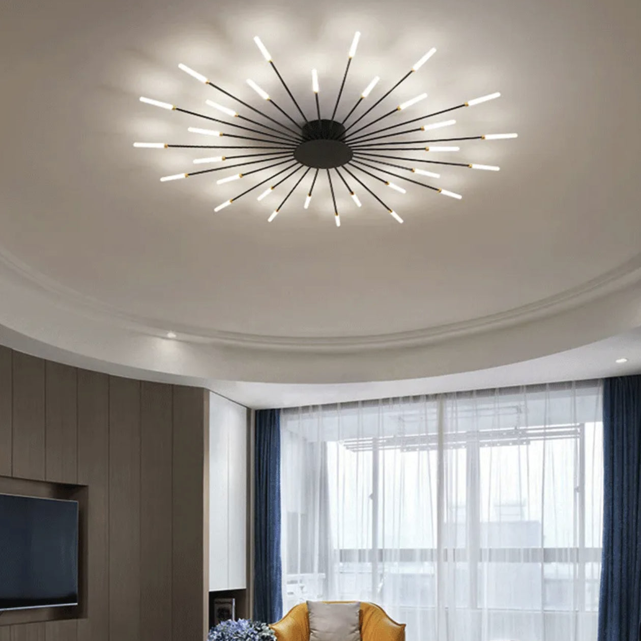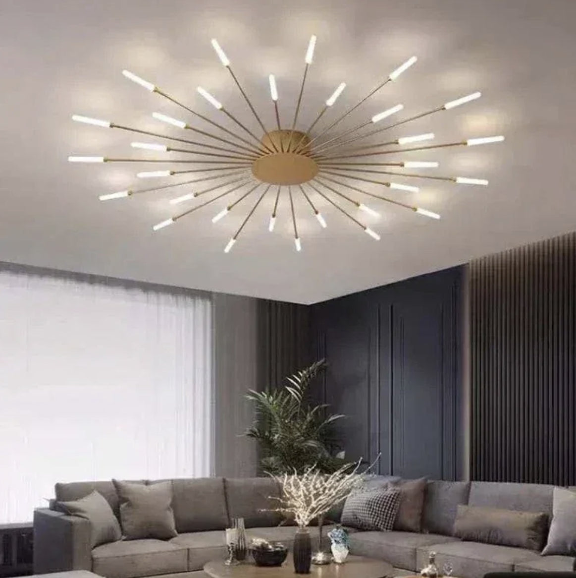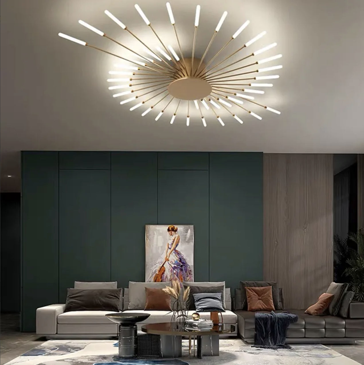 Questa lampada a soffitto LED moderna adotta un design sputnik. creando un effetto luminoso decorativo e spettacolare.La luce si diffonde a 360 gradi.Dotata di funzione dimmerabile, la luce è priva di sfarfallio e di luce blu nociva, proteggendo gli occhi e offrendo un'esperienza visiva confortevole.Offri un'esperienza di illuminazione confortevole per il tuo soggiorno.